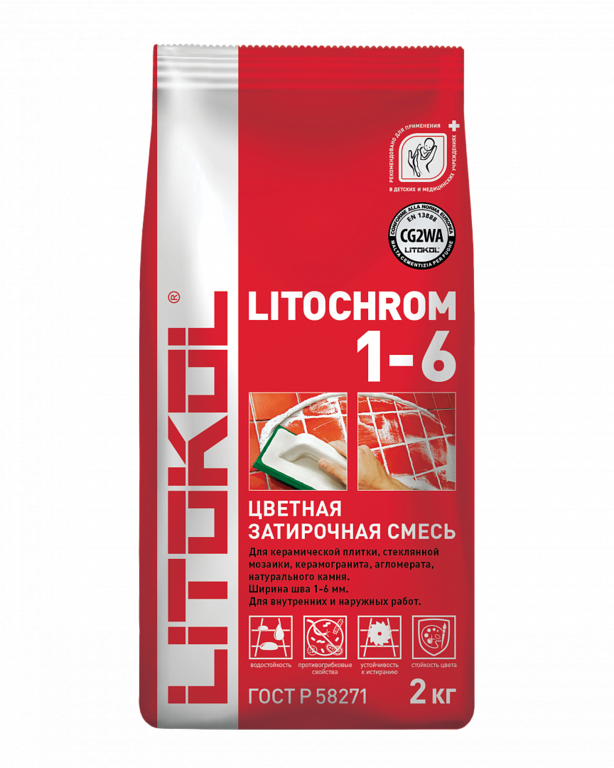 LITOCHROM 1-6 — цементная (С) затирочная смесь для межплиточных швов (G) с улучшенными техническими характеристиками (2) с пониженным водопоглощением (W) и с повышенной стойкостью к истиранию (A) относится к классу CG2WA согласно классификации Европейских Норм 13888 и по ГОСТ Р 58271.